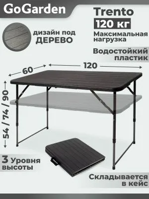 Садовый стол TRENTO с 3-ч позиционной регулировкой по высоте и классическим дизайном столешницы под дерево цвета венге внесет уют в дачную обстановку где бы Вы его не использовали внутри помещения или на террасе.
