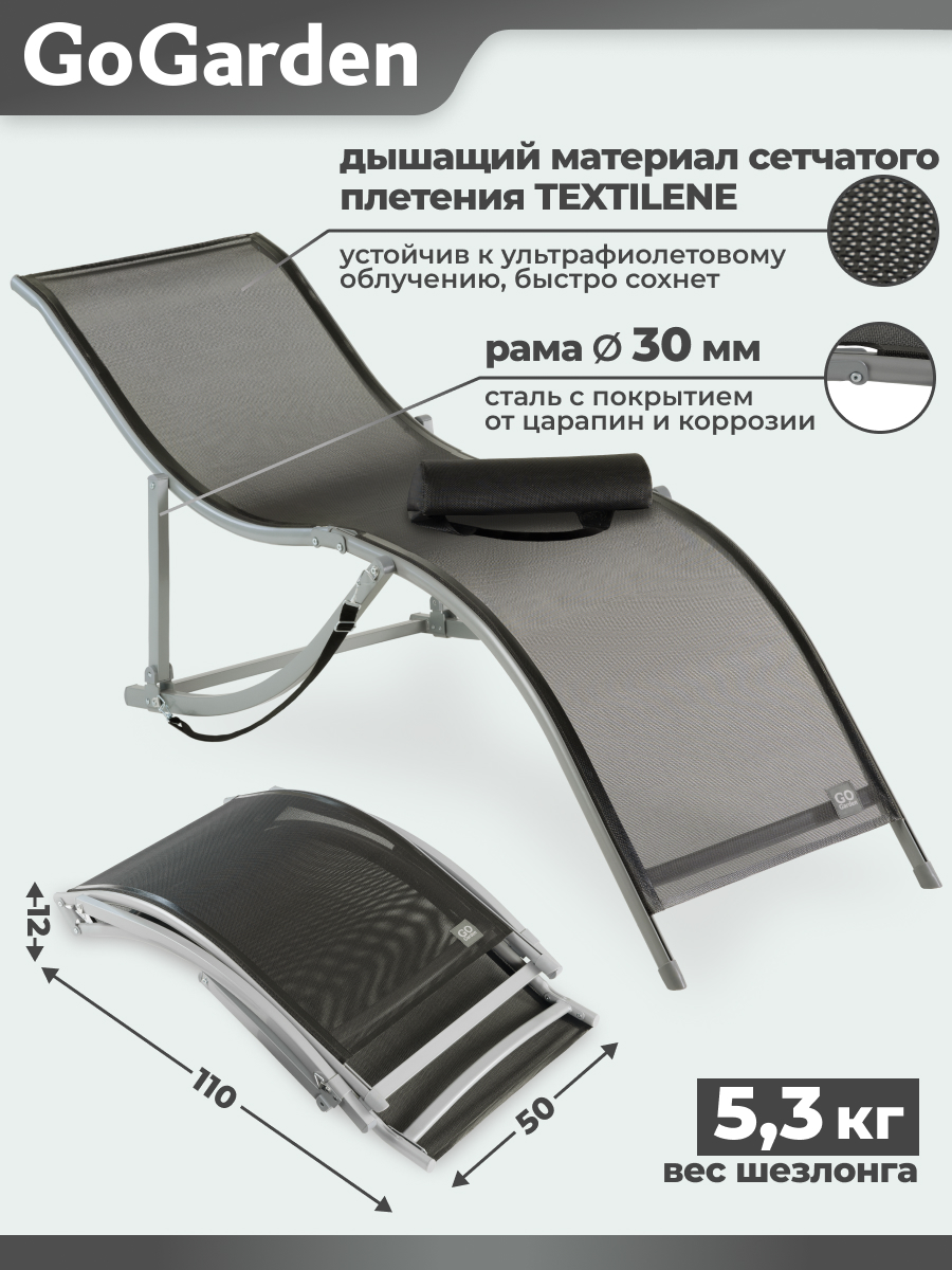 Анатомическая форма сиденья шезлонга обеспечивает прекрасную поддержку спины и ног. Сиденье сделано из сетчатого материала TEXTILENE устойчивого к ультрафиолетовому излучению и образованию плесени. Благодаря своей структуре материал не впитывает влагу, быстро сохнет и очень простой в уходе.